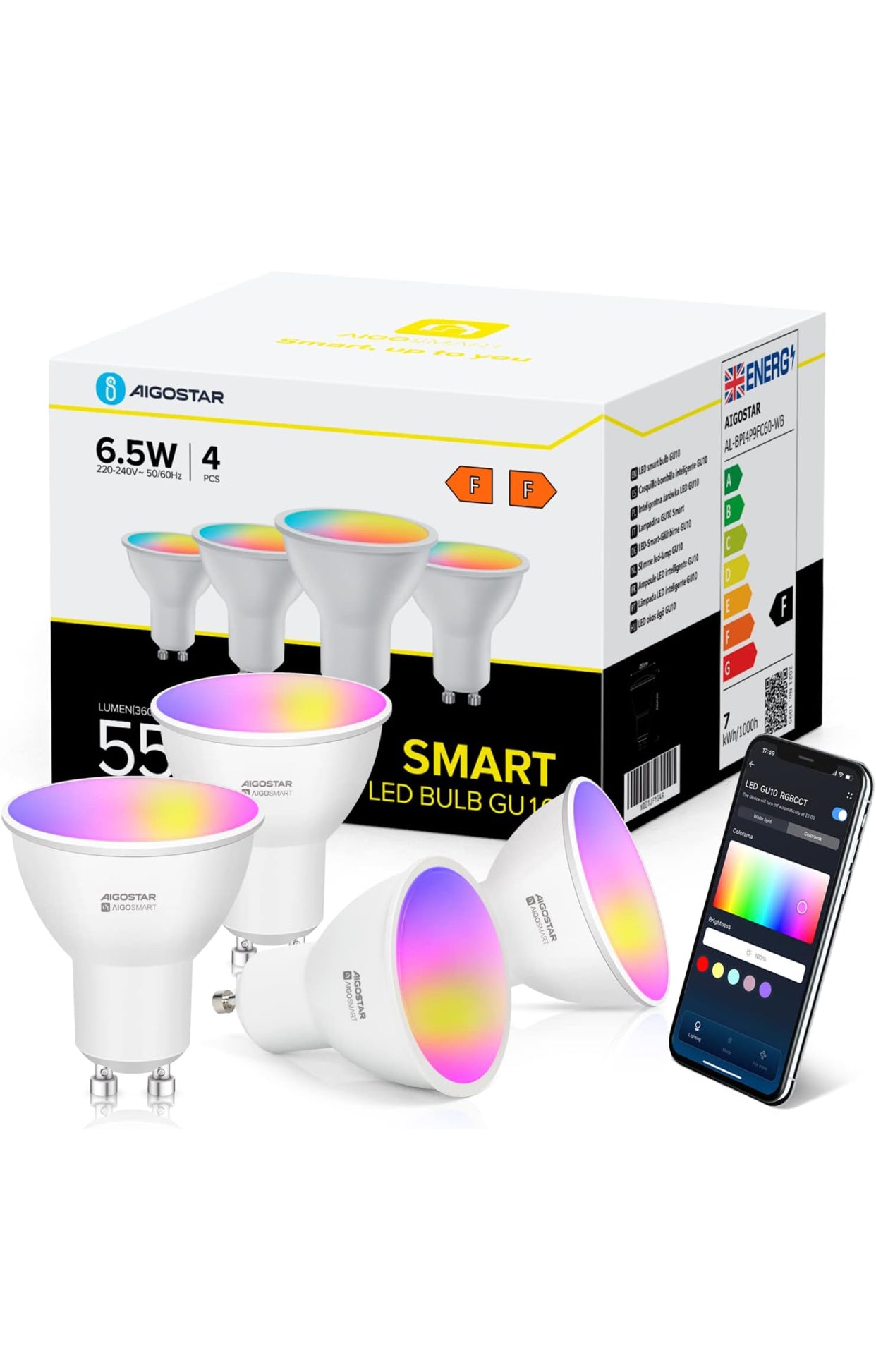 Aigostar Bombilla Inteligente LED GU10 SL2 Bombillas Alexa 6.5W Bombilla Wifi RGB & 2700K-6500K Regulable, Controladas por APP, Conexión rápida Compatible Con Google Home/Alexa, 4 Unidads