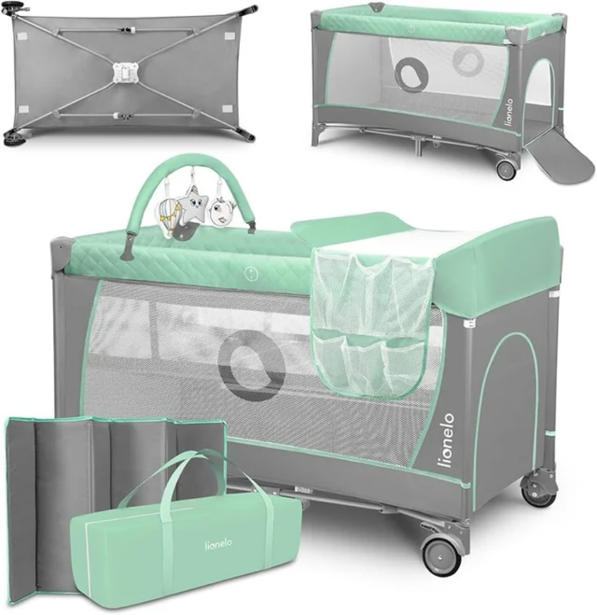 LIONELO Flower Camita de viaje Para niños hasta 15 kg Colchón Organizador 2 Reudas Compacta Bolsa para transportar