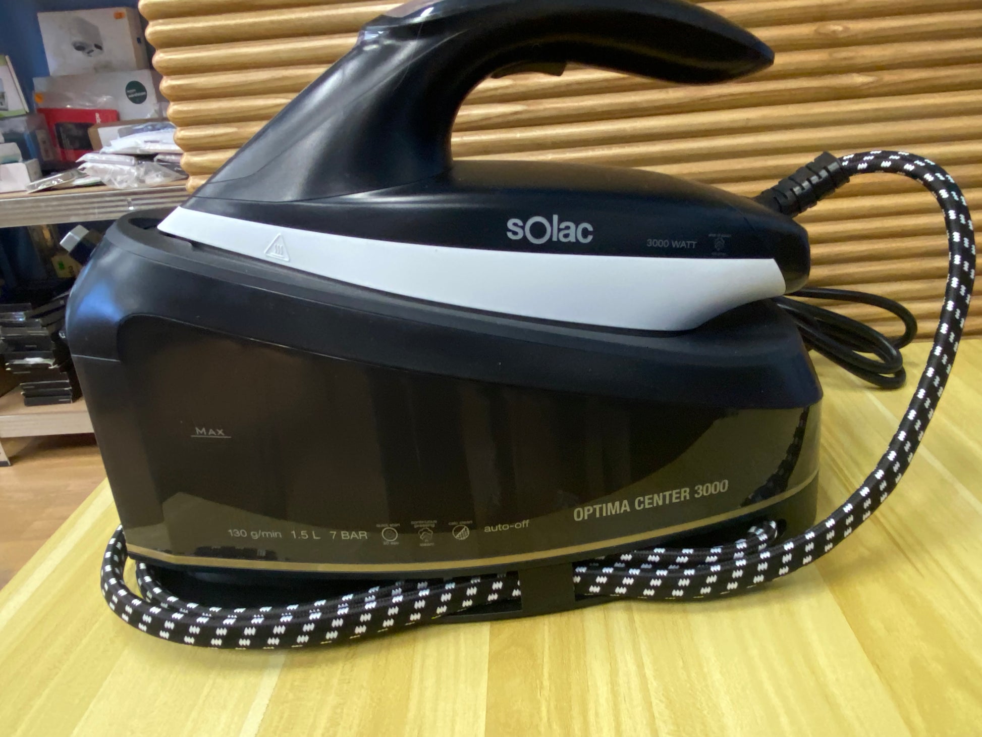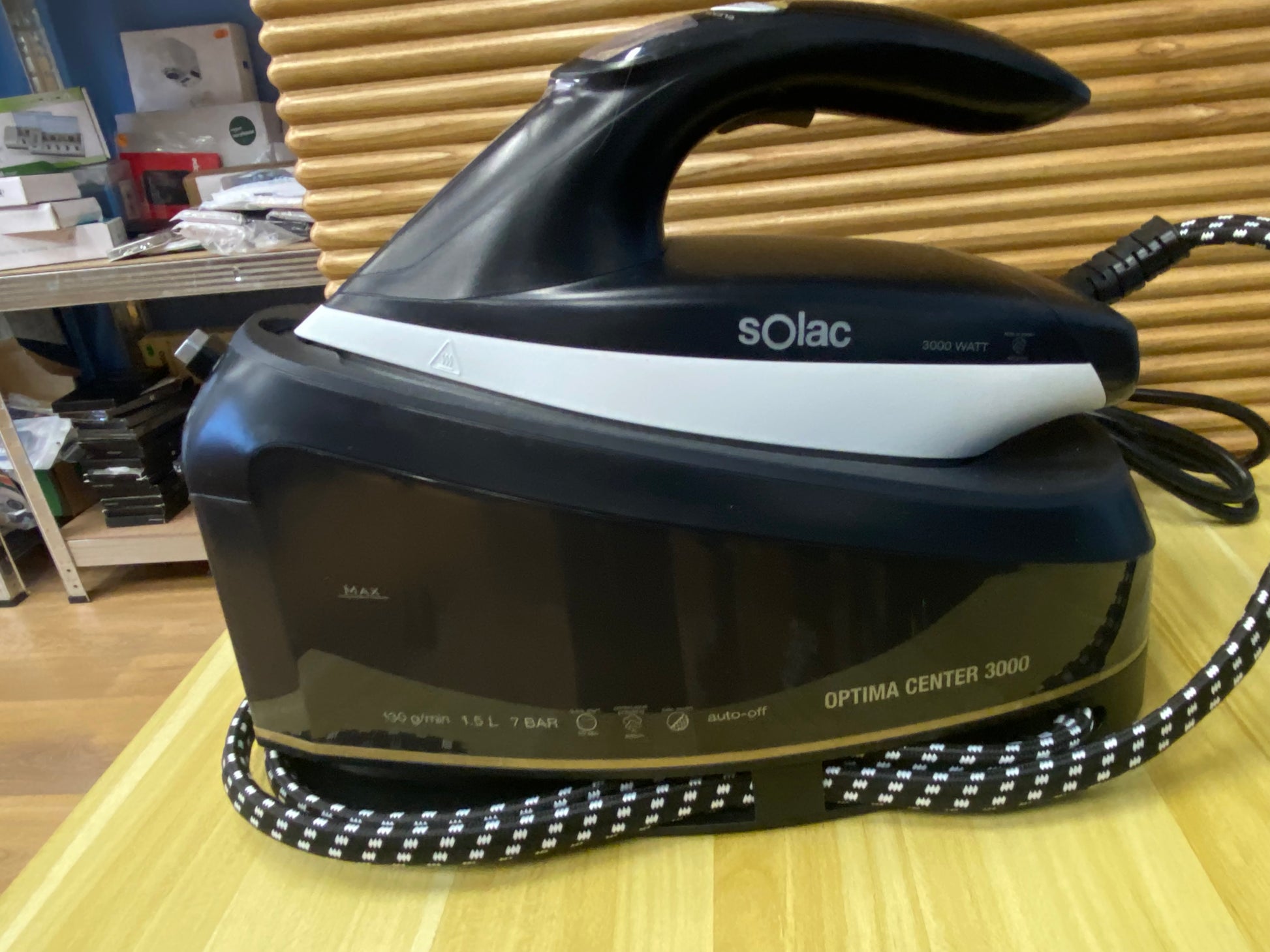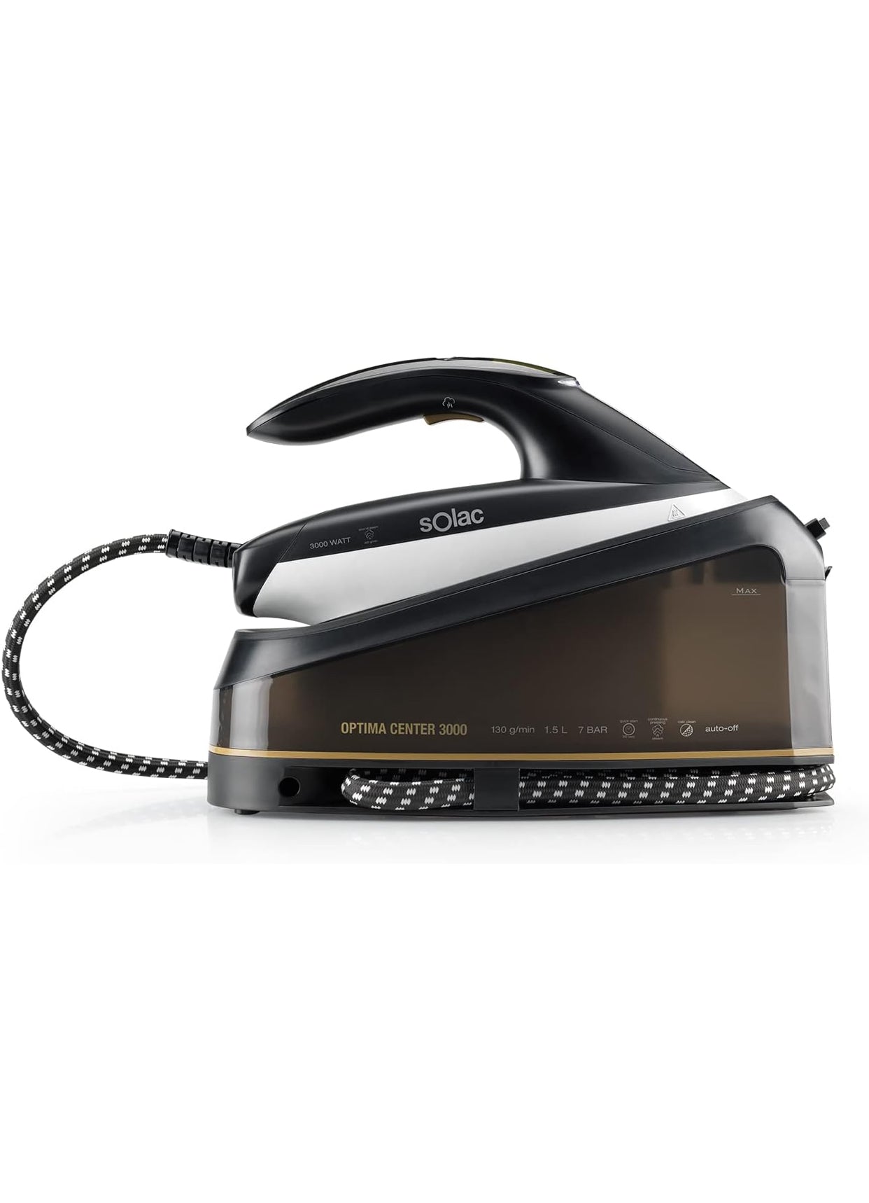 - Sistema patentado por Solac: transporte y bloqueo; fija la plancha al calderín y transporta cómodamente el centro de planchado; cuenta con espacio para guardar el cable