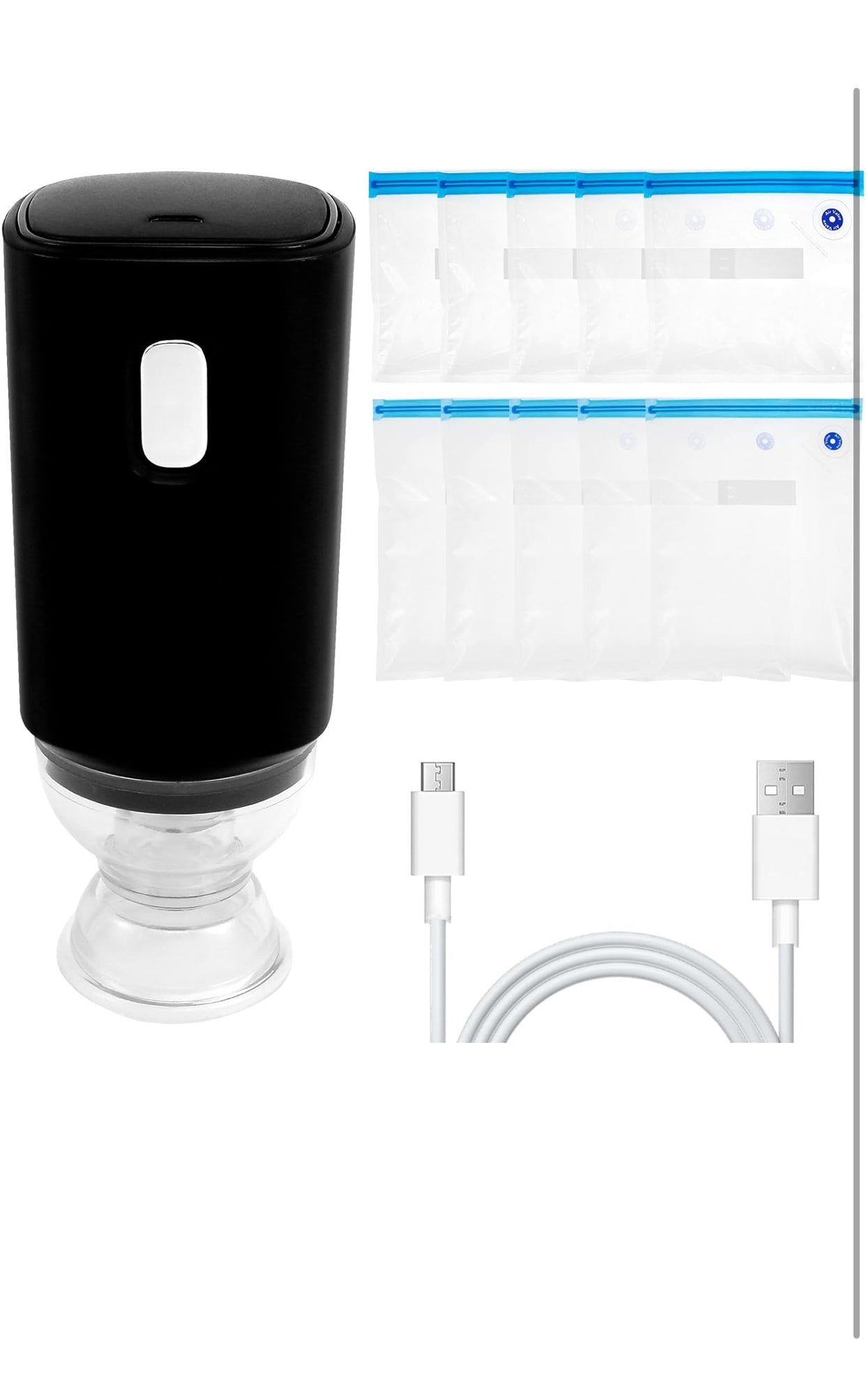 - Tamaño compacto: la bomba de bolsa de vacío eléctrica es compacta y se adapta a la encimera y ocupa menos espacio. Adecuado para envasar pequeñas piezas de frutas, verduras, etc