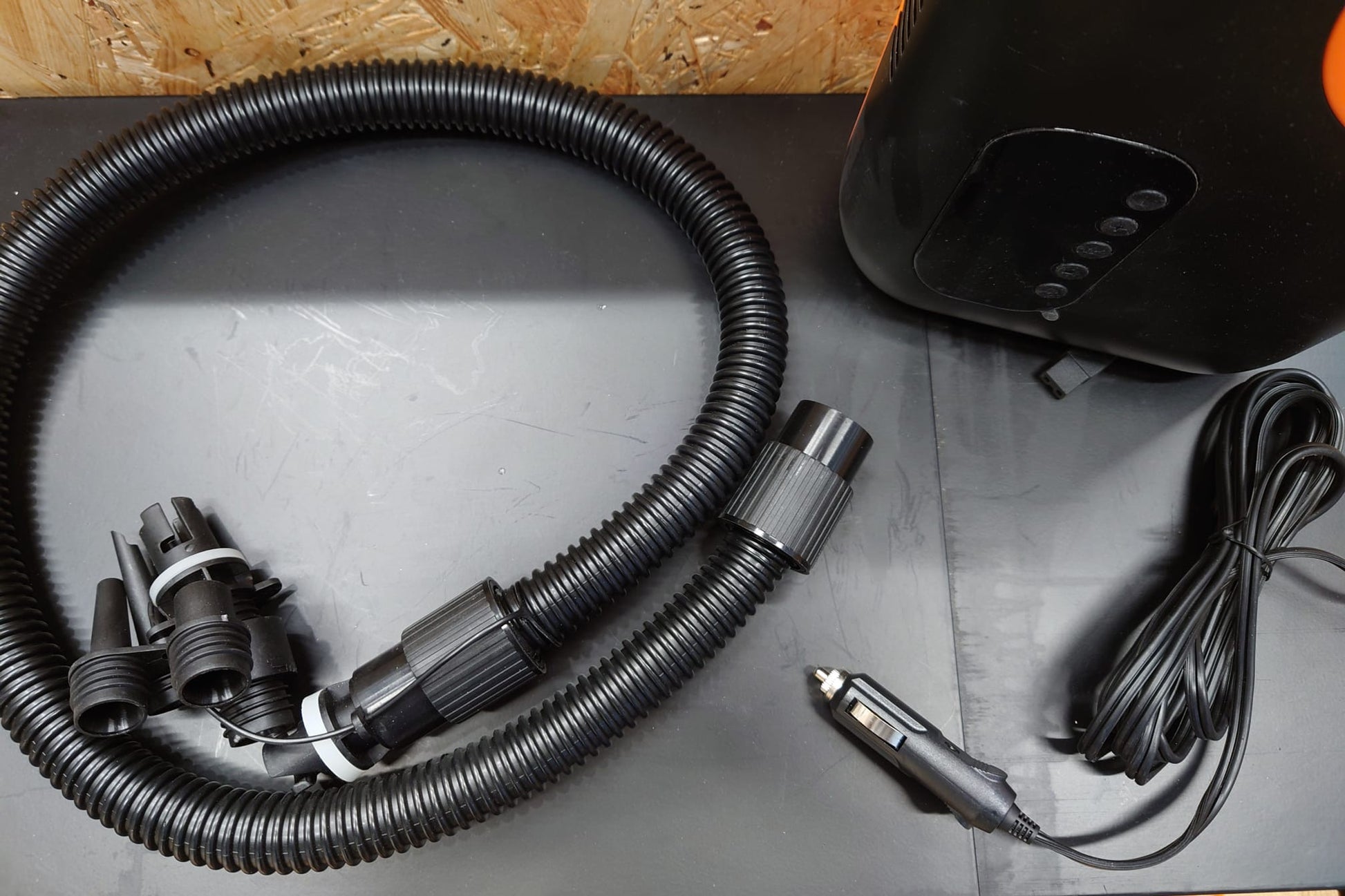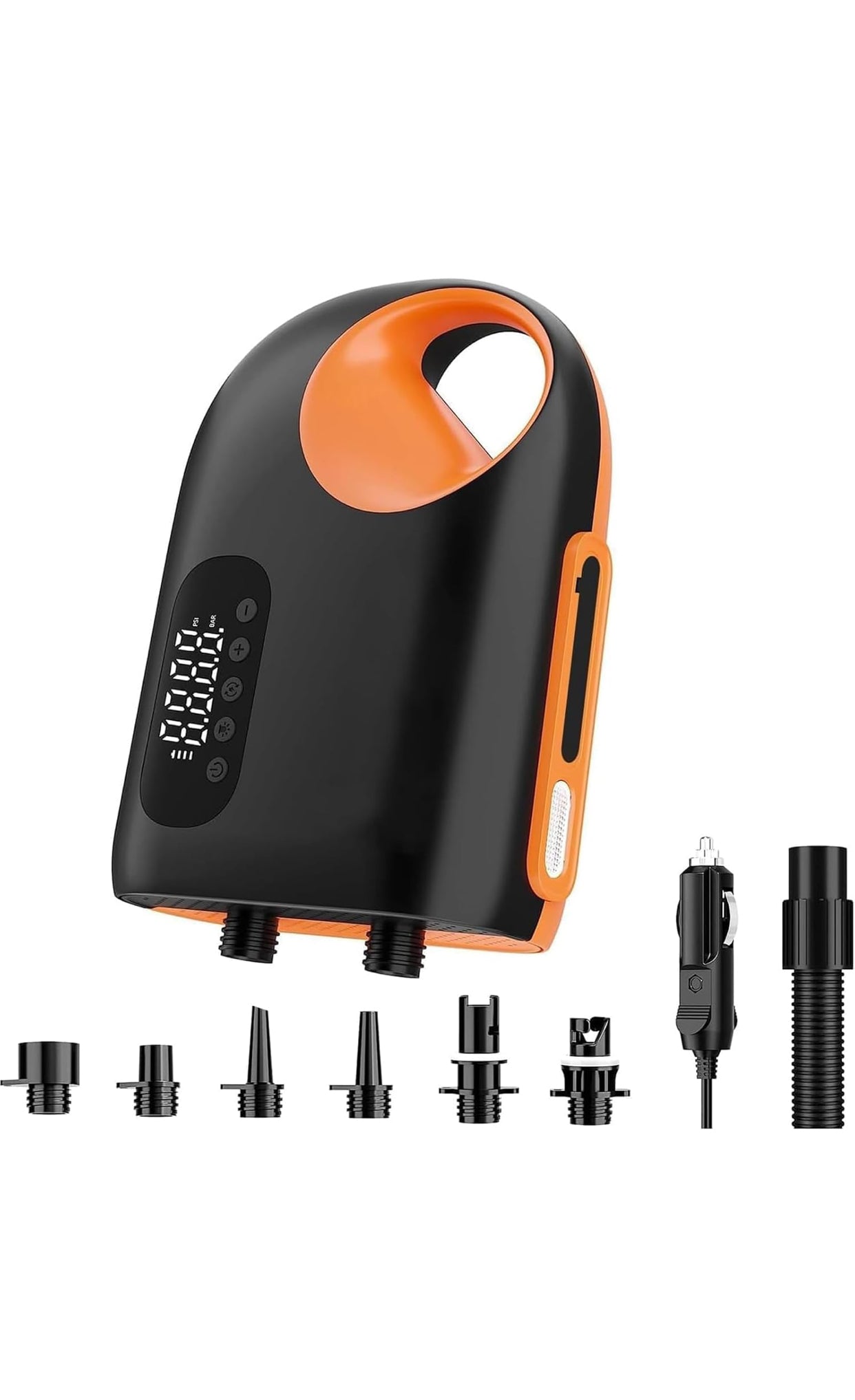 - Bomba de Aire Portátil: bomba de aire eléctrica de 11,0 x 7,3 x 3,5 pulgadas (28 x 18,5 x 9 cm) y con un peso de solo 3,3 libras (1,5 kg), es una bomba de aire de remo eléctrica compacta y exquisita que se puede almacenar fácilmente en una mochila o equipaje para facilitar su transporte